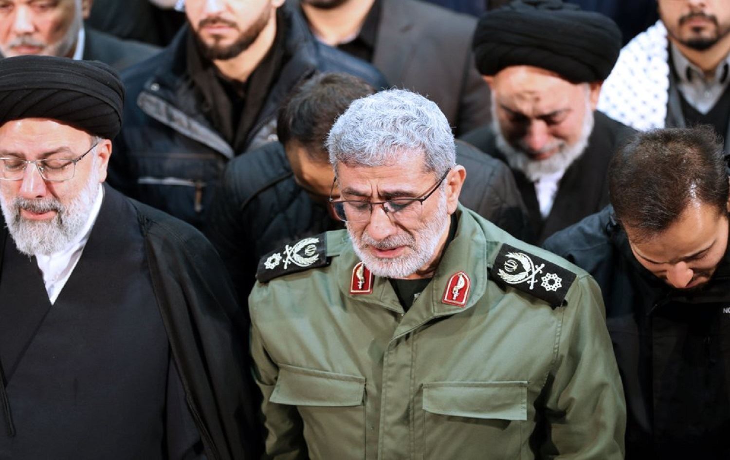 Esmail Ghaani, newly appointed commander of Iran's Revolutionary Guards Quds Force, weeps while praying over the coffin of the force's previous head Gen. Qassem Soleimani at the Tehran University Campus in Tehran, Iran, Monday, Jan. 6, 2020. Photo: Office of the Iranian Supreme Leader via AP