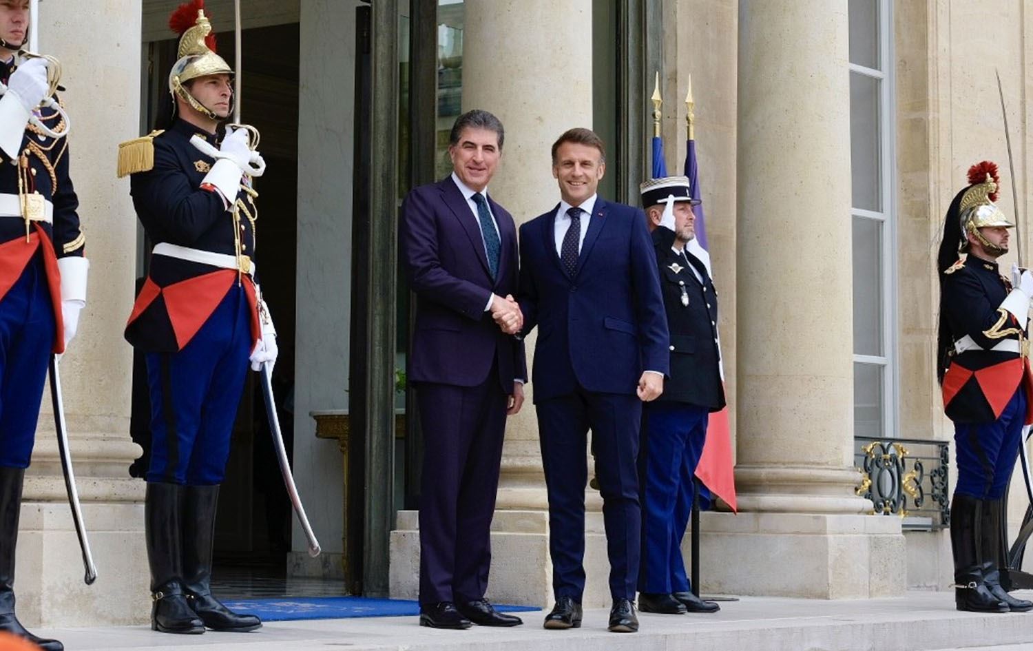 Kurdistan Region President Nechirvan Barzani (left) being received by French President Emmanuel Macron at the Elysee Palace in Paris on April 14, 2023. File photo: Lam Duc Hilen/Submitted