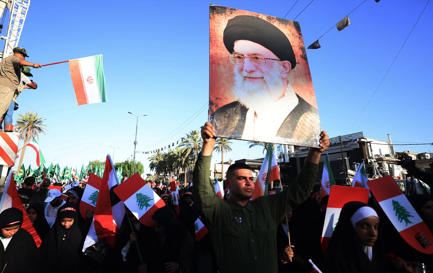 Iraqis wave a portrait of Iran's supreme leader Ayatollah Ali Khamenei as they march in the Kadhimiya district of Baghdad on June 21, 2025, to protest against Israel's strikes on Iran. Photo: AFP