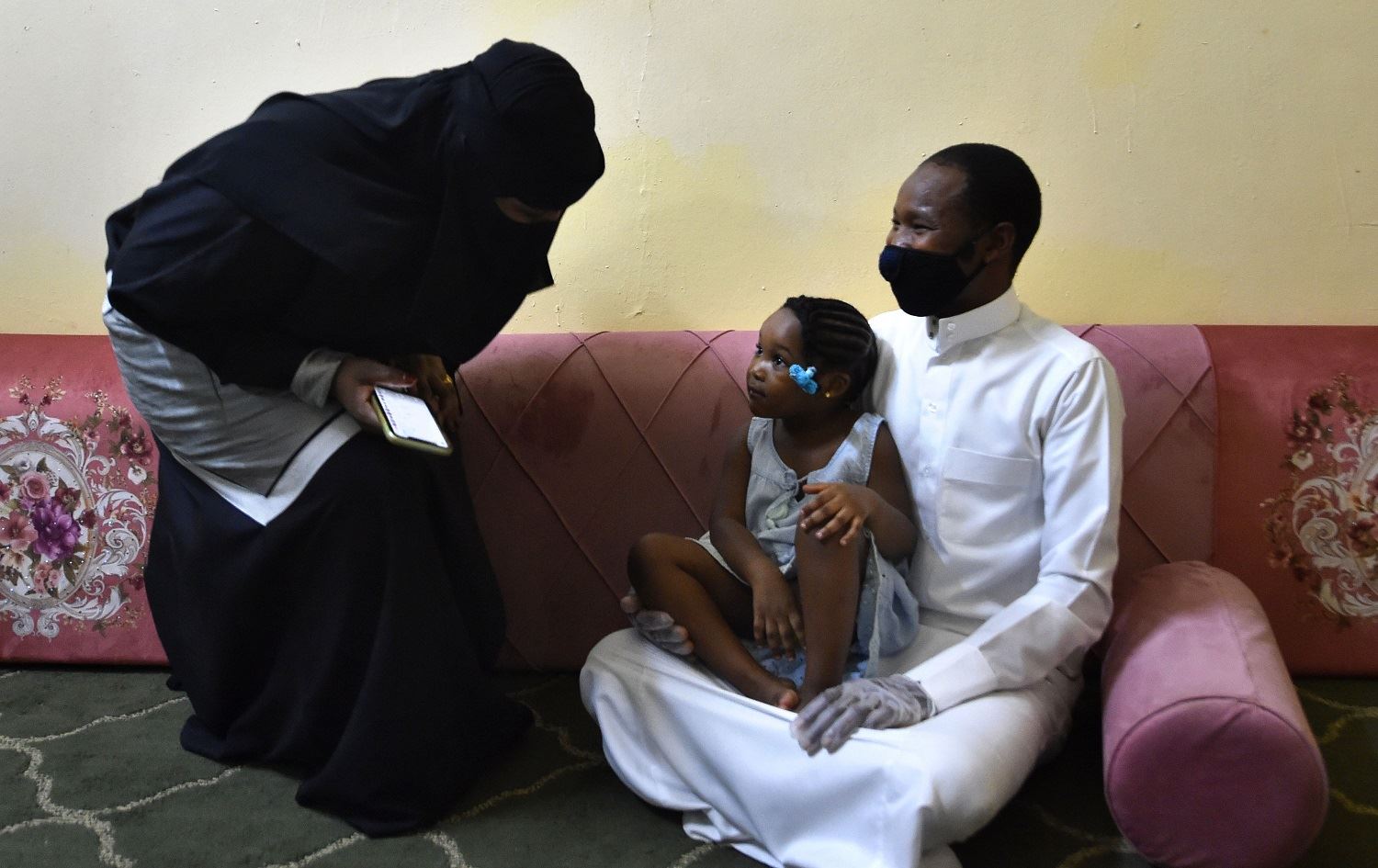 Nasser Younes Solebarmo (right), a Riyadh-based Nigerian expat sits near his wife and daughter on July 15, 2020. Photo: Fayez Nureldine / AFP