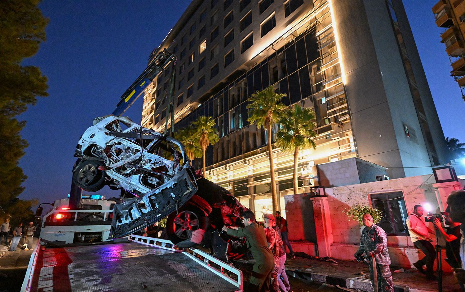 Syrian emergency and security services inspect the wreckage of a car that exploded in Damascus on October 21, 2024. Photo: Louai Beshara/AFP