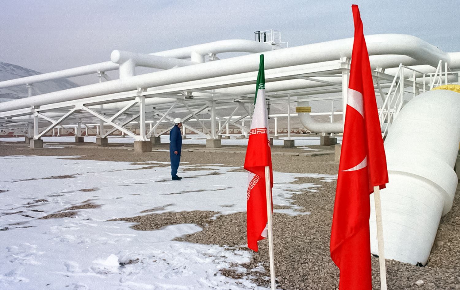 Iranian worker stands in front of gas pipelines next to flags of Turkey and Iran. Photo: AFP