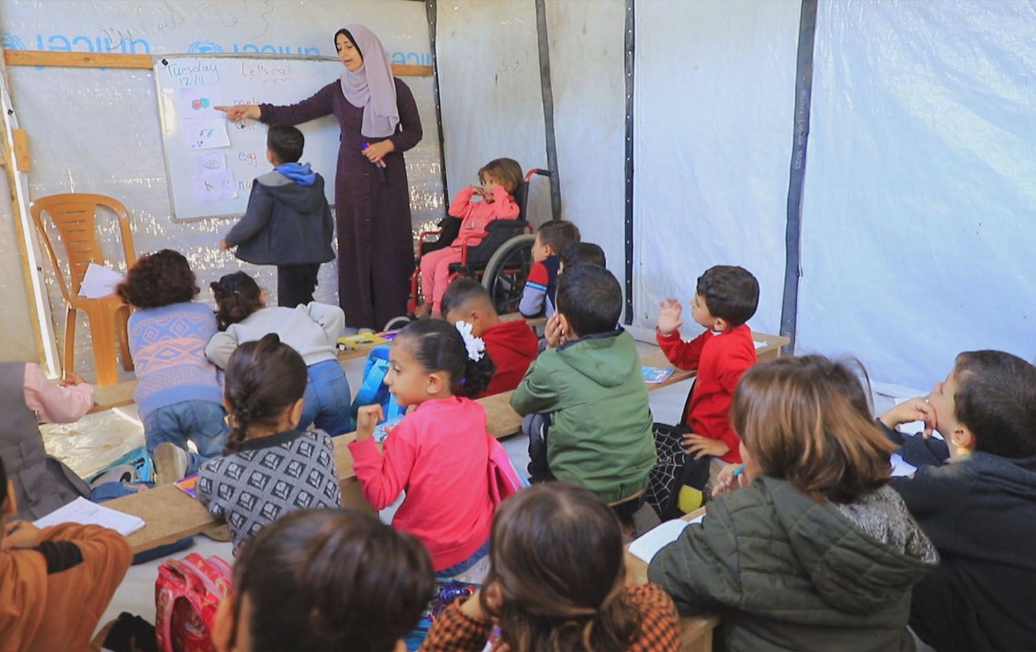 Students during a lecture inside one of the makeshift camps in Khan Younis, Gaza Strip. Photo: Rudaw