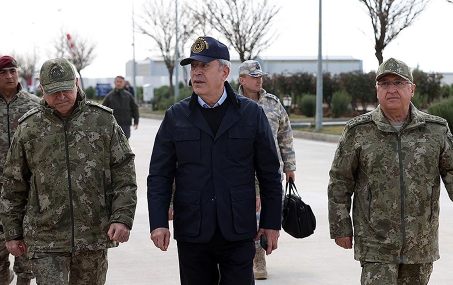 Turkish Defense Minister Hulusi Akar (center) touring a military base in Kahramanmaras province on February 25, 2023. Photo: AA