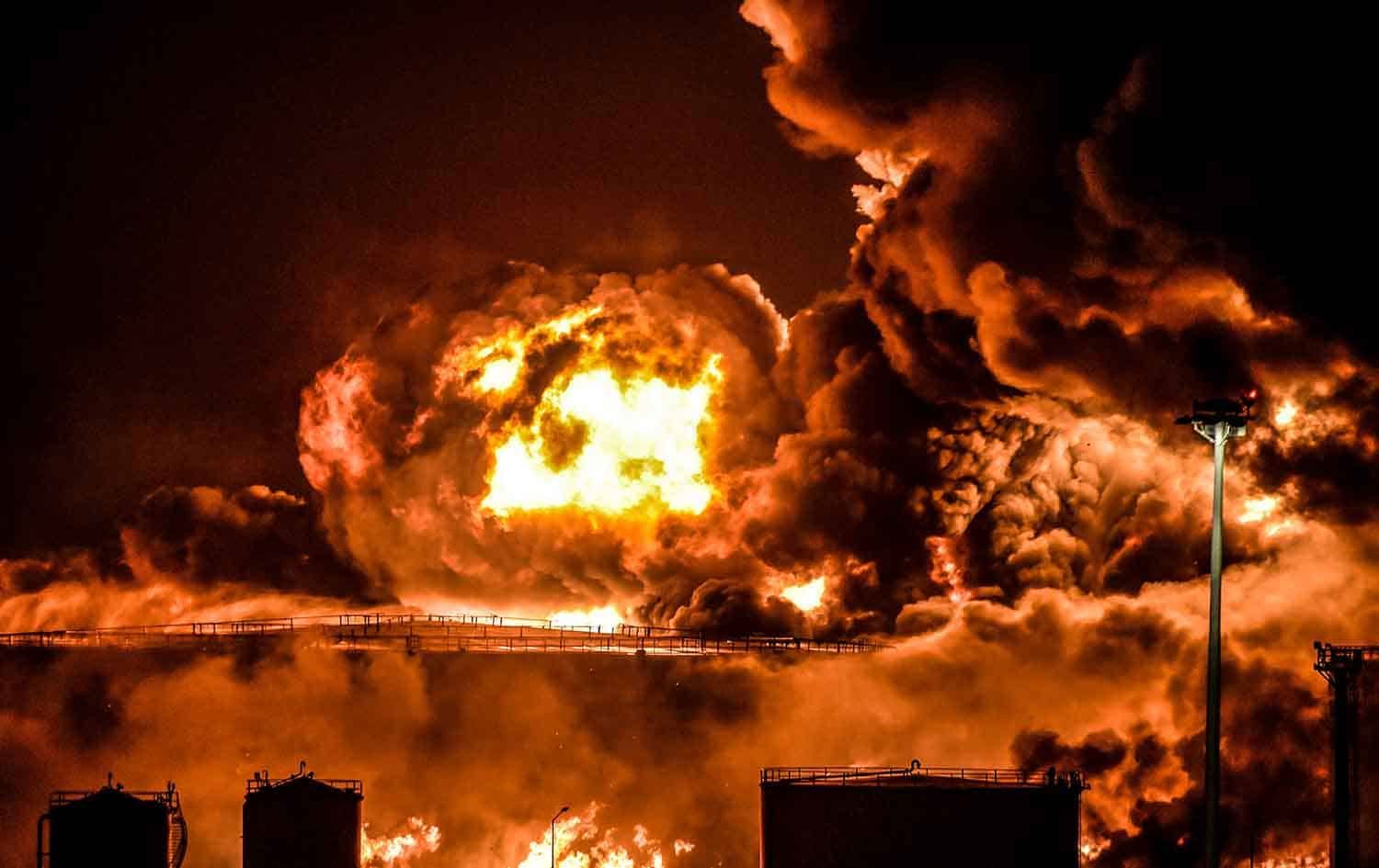 Smoke and flames rise from a Saudi Aramco oil facility following a Houthi attack in Jeddah, Saudi Arabia, on March 25, 2022. Photo: AFP