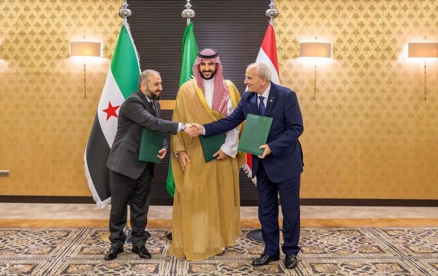 Syrian Defense Minister Murhaf Abu Qasra (left), Saudi Defense Minister Khalid bin Salman (center), and Lebanese Defense Minister Michel Mansi (right) in Jeddah on March 27, 2025. Photo: Saudi Arabia state media