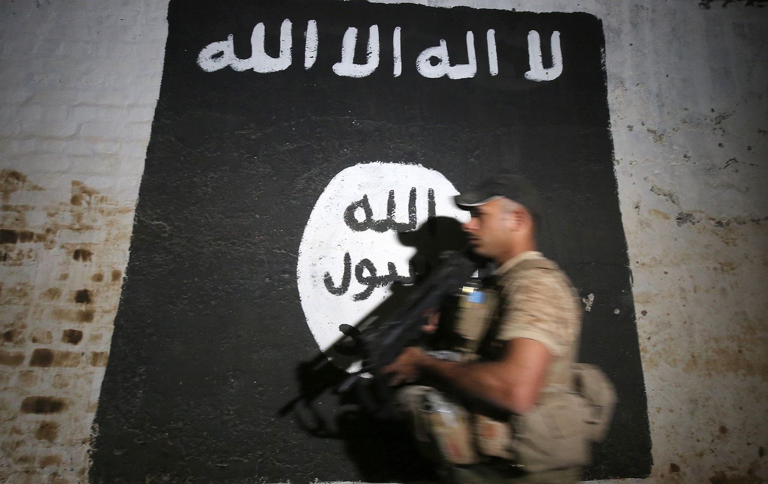 An Iraqi soldier walks past a mural bearing the logo of the Islamic State group in Albu Sayf, near Mosul, March 1, 2017. File photo: Ahmad al-Rubaye / AFP