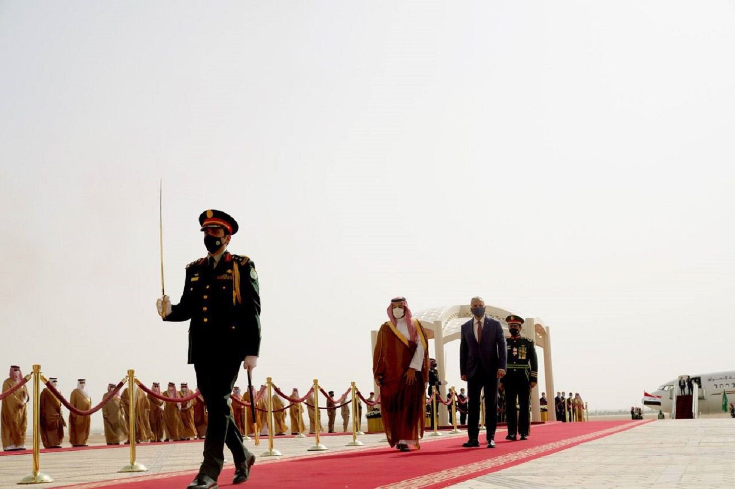 Iraqi PM Mustafa al-Kadhimi arrived at the Saudi capital of Riyadh on Wednesday, where he was welcomed by Saudi crown prince Mohammed bin Salman.