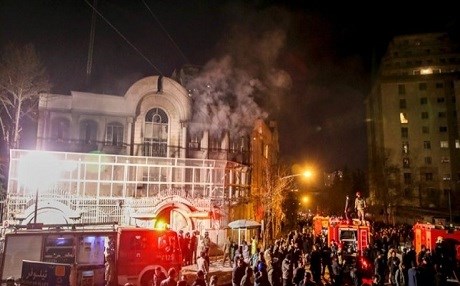 The fire in the Tehran embassy was caused by throwing firecrackers by the crowd but was extinguished shortly thereafter. The crowd also ransacked the embassy by breaking furniture and windows.
