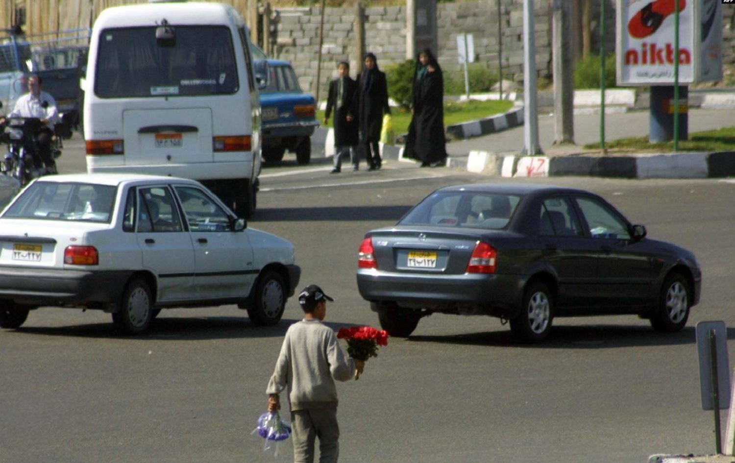 An Iranian boy sells flowers in the north of the Iranian capital of Tehran in May 2002. Photo: Behrouz Mehri / AFP
