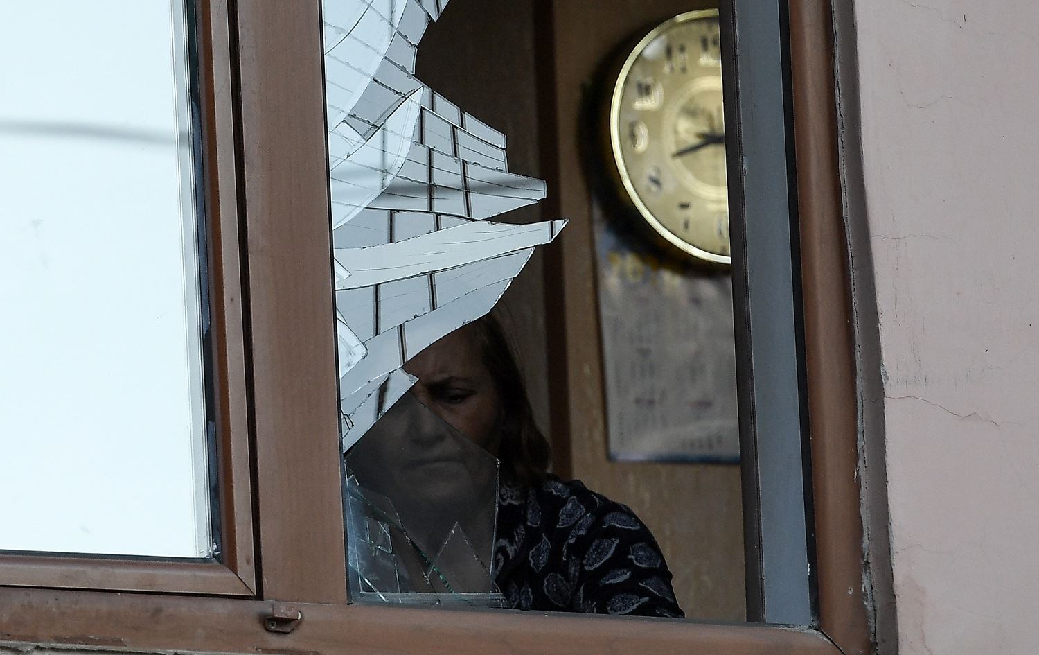 A woman is seen through a broken window in an apartment building that was supposedly damaged by recent shelling in the breakaway Nagorno-Karabakh region's main city of Stepanakert on October 3, 2020. Photo: AFP