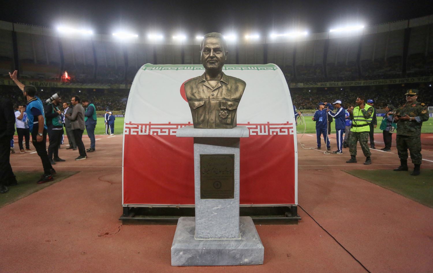 A bust of slain IRGC commander Qasem Soleimani on the pitch at the Naghsh-e-Jahan Stadium in Isfahan, Iran on October 2, 2023. Photo: Morteza Salehi/AFP