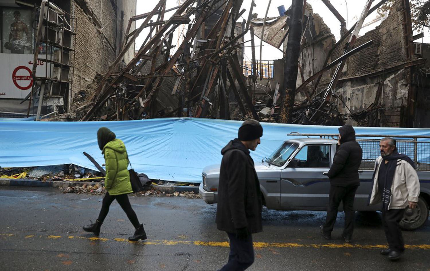 People walk past buildings burned during recent protests in Shahriar, Iran, November 20, 2019. File photo: Vahid Salemi / AP