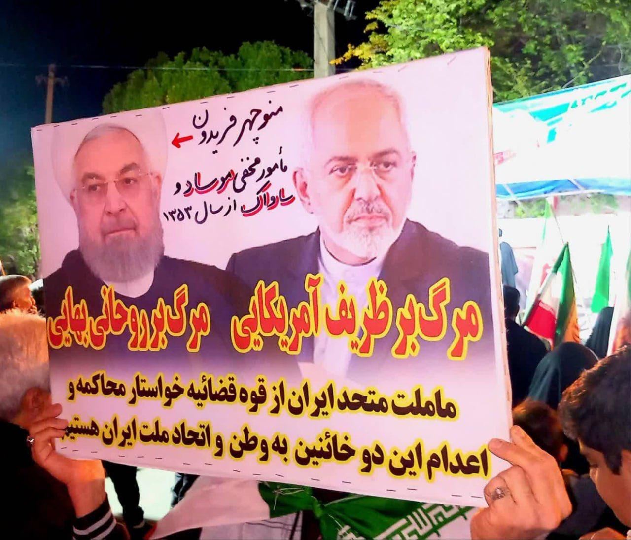 Photos of Zarif were seen in videos on social media being set on fire. One banner in a protest went as far as calling on the judiciary to try Zarif and former President Hassan Rouhani and hang them as traitors.
