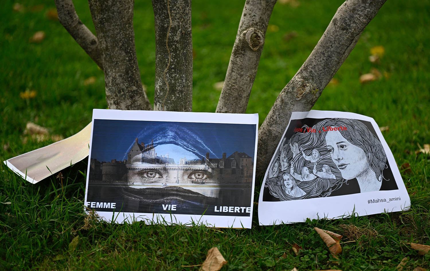 Posters are seen on the grass during a demonstration in support of Kurdish Iranian woman Mahsa Amini during a protest on October 3, 2022 in Nantes, western France. Photo: Damien Meyer/AFP