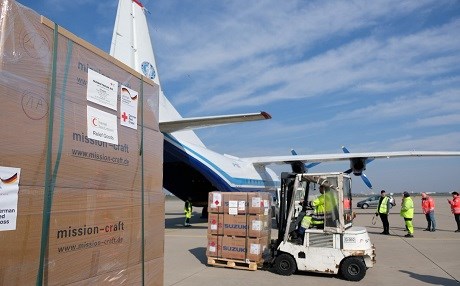 The global aid has arrived despite claims from Tehran that US sanctions were blocking relief efforts.
