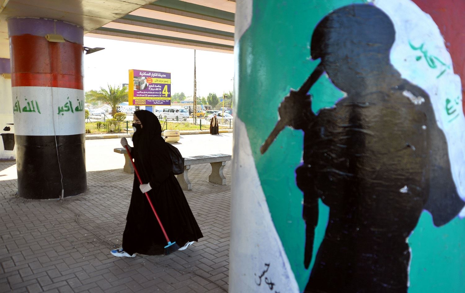 Volunteers clean up the streets of the central city of Najaf following anti-government protests, December 5, 2019. Photo: Haidar Hamdani / AFP