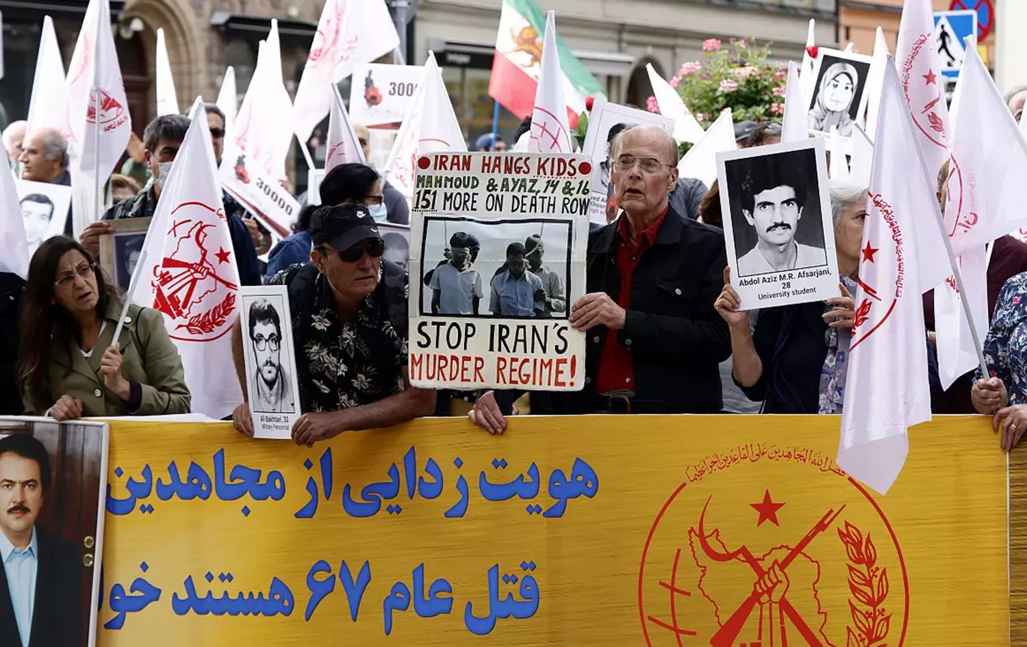 Supporters of the People's Mojahedin Organization of Iran protest outside Stockholm's district court on the first day of the trial of Hamid Nouri on Aug. 10, 2021. Photo: Stefan Jerrevang/AP