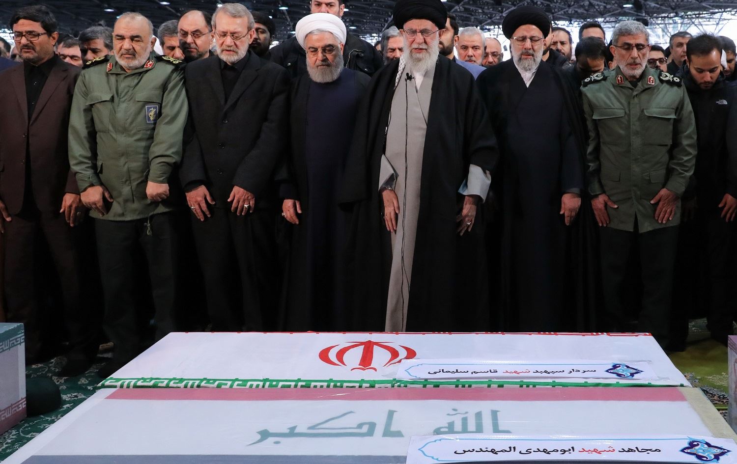 Supreme Leader Ali Khamenei, flanked by officials including President Hassan Rouhani, IRGC chief Hossein Salami and newly-appointed Quds Force head Esmail Qaani, pray over the bodies of General Soleimani and PMF commander Abu Mahdi al-Mohandis at Tehran University on January 6, 2020. Photo: Khamenei.ir