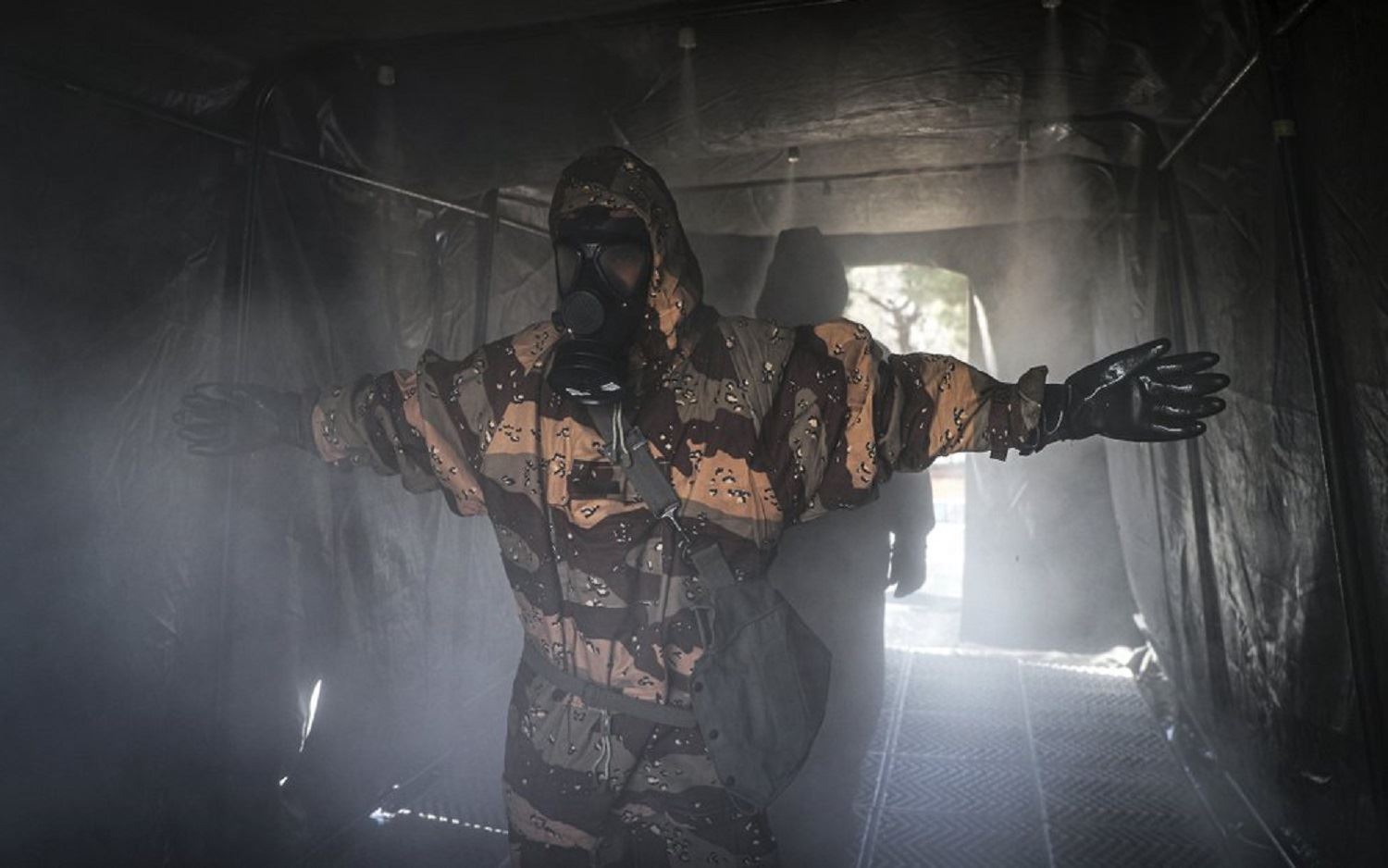 An Iranian army member disinfects his protective gear against the new coronavirus in Tehran on March 1, 2020. Photo: Mahmood Hosseini / Tasnim News Agency via AP