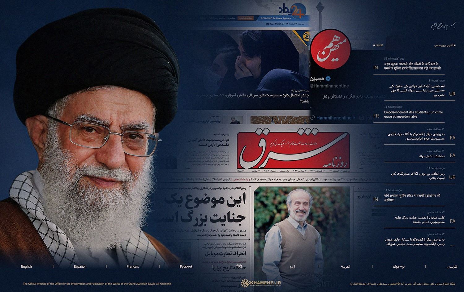 Screengrabs of Supreme Leader Ayatollah Ali Khamenei’s official website and the outlets under investigation (Hammihan, Rouydad24 and Shargh). Graphic: Rudaw