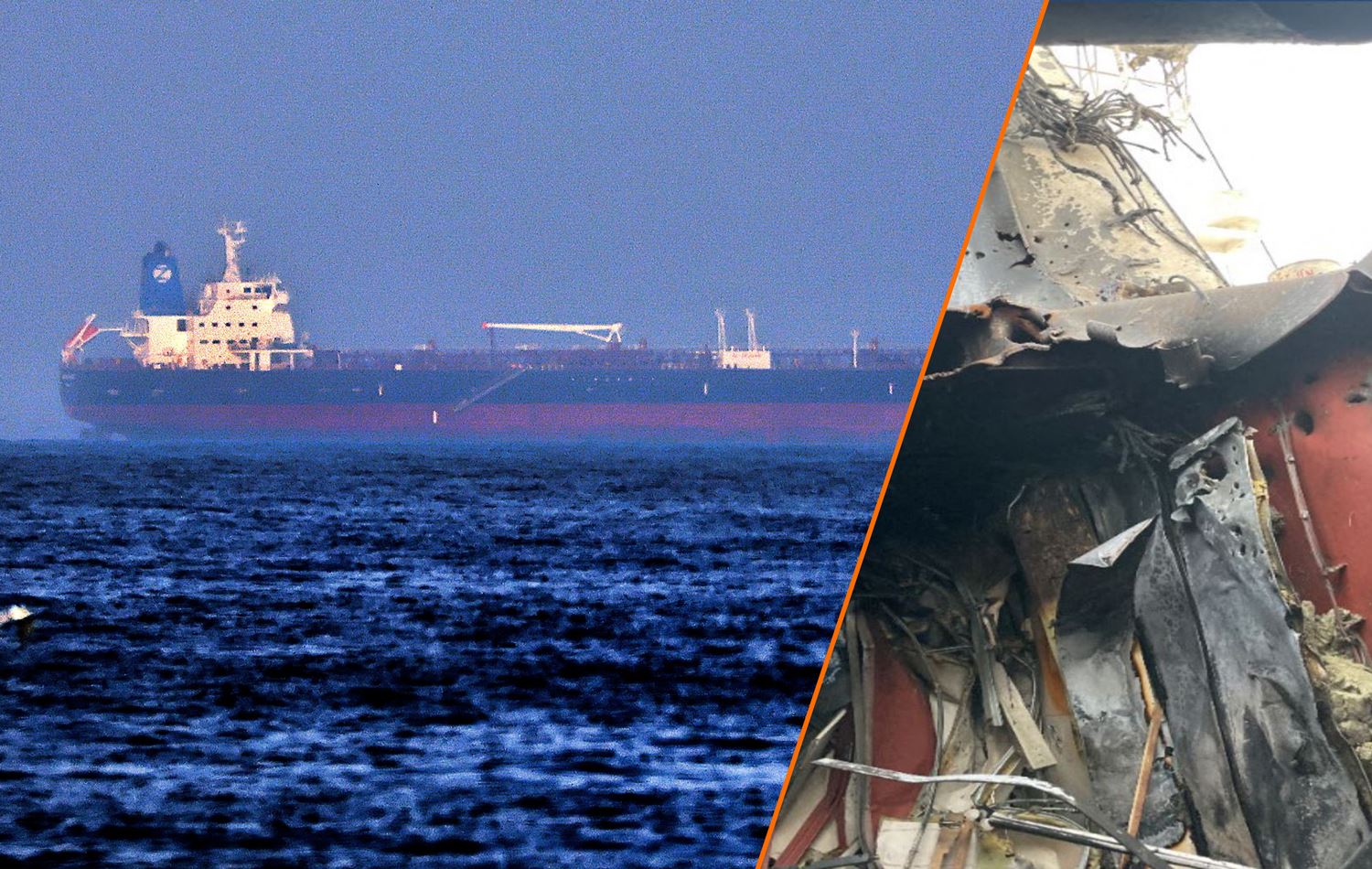 The Mercer Street was hit in a drone attack off the coast of Oman on July 29. Photos: Left: Karim Sahib/AFP; Right: US Navy Captain Bill Urban/US Navy/AFP