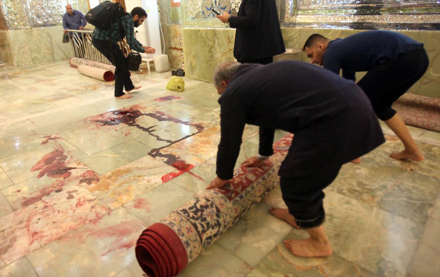 Workers clean up the scene following the attack on the Shah Cheragh shrine in Shiraz, Iran on October 26, 2022. Photo: AFP