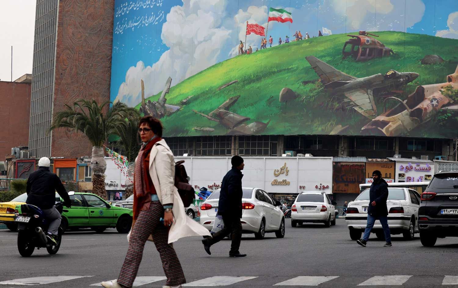 An Iranian woman walks past a huge anti-US billboard displayed on a building in Tehran's Valiasr Square on February 8, 2026. Photo: AFP