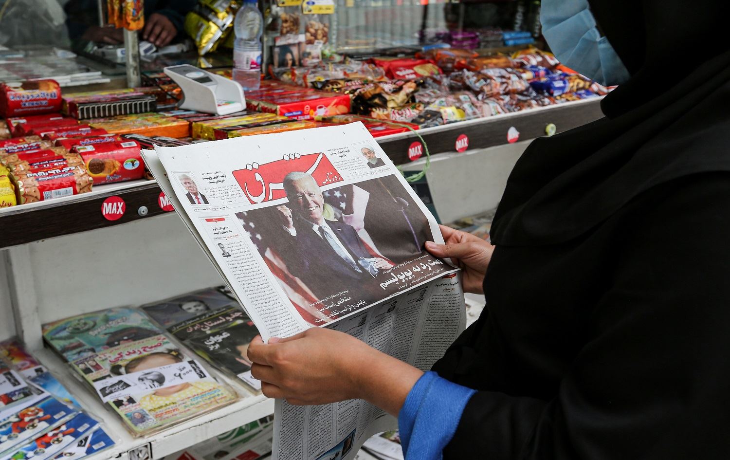A woman browses the front page of Iranian newspaper Shargh at a news stand in Iran's capital Tehran on November 8, 2020. Photo: Atta Kenare/AFP