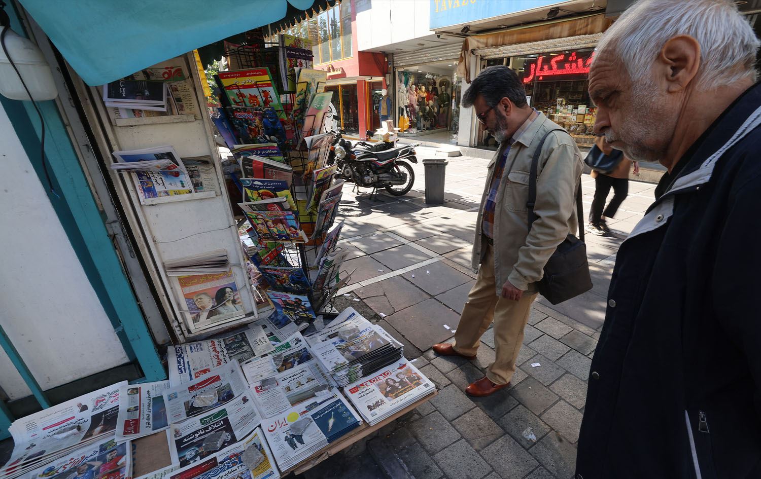 Iranian men look at local newspapers at a news stand in Tehran, following the US presidential election on November 6, 2024. Photo: Atta Kenare/AFP