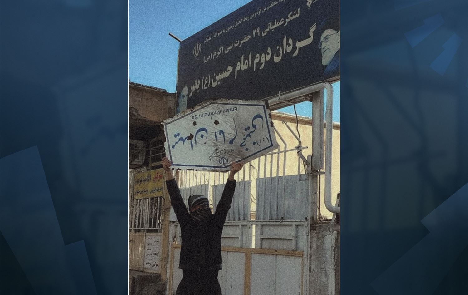 A defiant young man holds a street sign reading “Imam Khomeini”, the founder of the Islamic Republic, and stands outside the Islamic Revolutionary Guard Corps (IRGC) in the Kurdish town Javanrud, western Iran (Rojhelat) on December 31, 2022. Photo: Javanrud Telegram channels