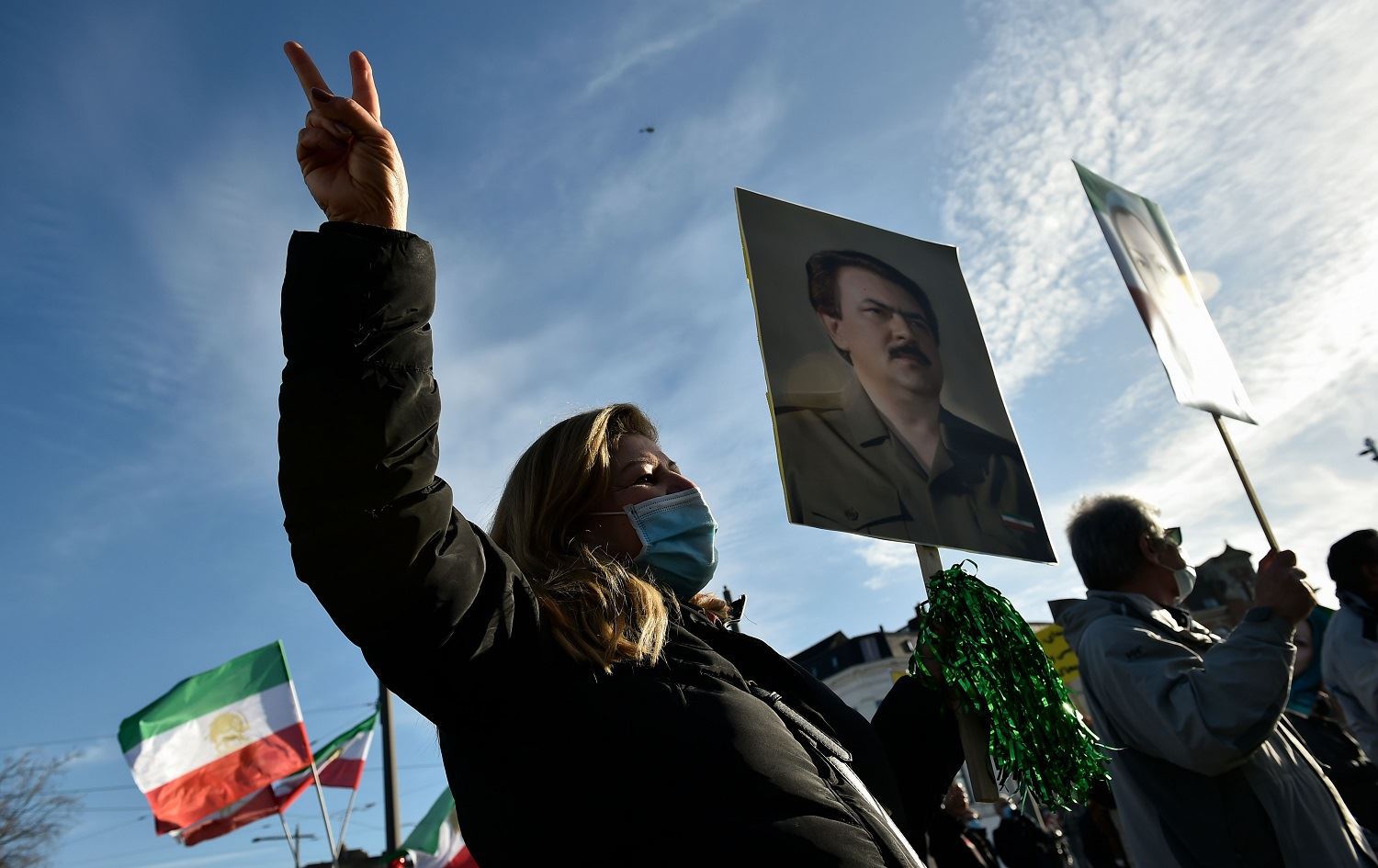 People wave the former Iranian flag and hold portraits as they protest outside the Antwerp courthouse, on February 4, 2021, during the trial of four suspects including an Iranian diplomat accused of taking part in a plot to bomb an opposition rally in France. Photo: John Thys/AFP