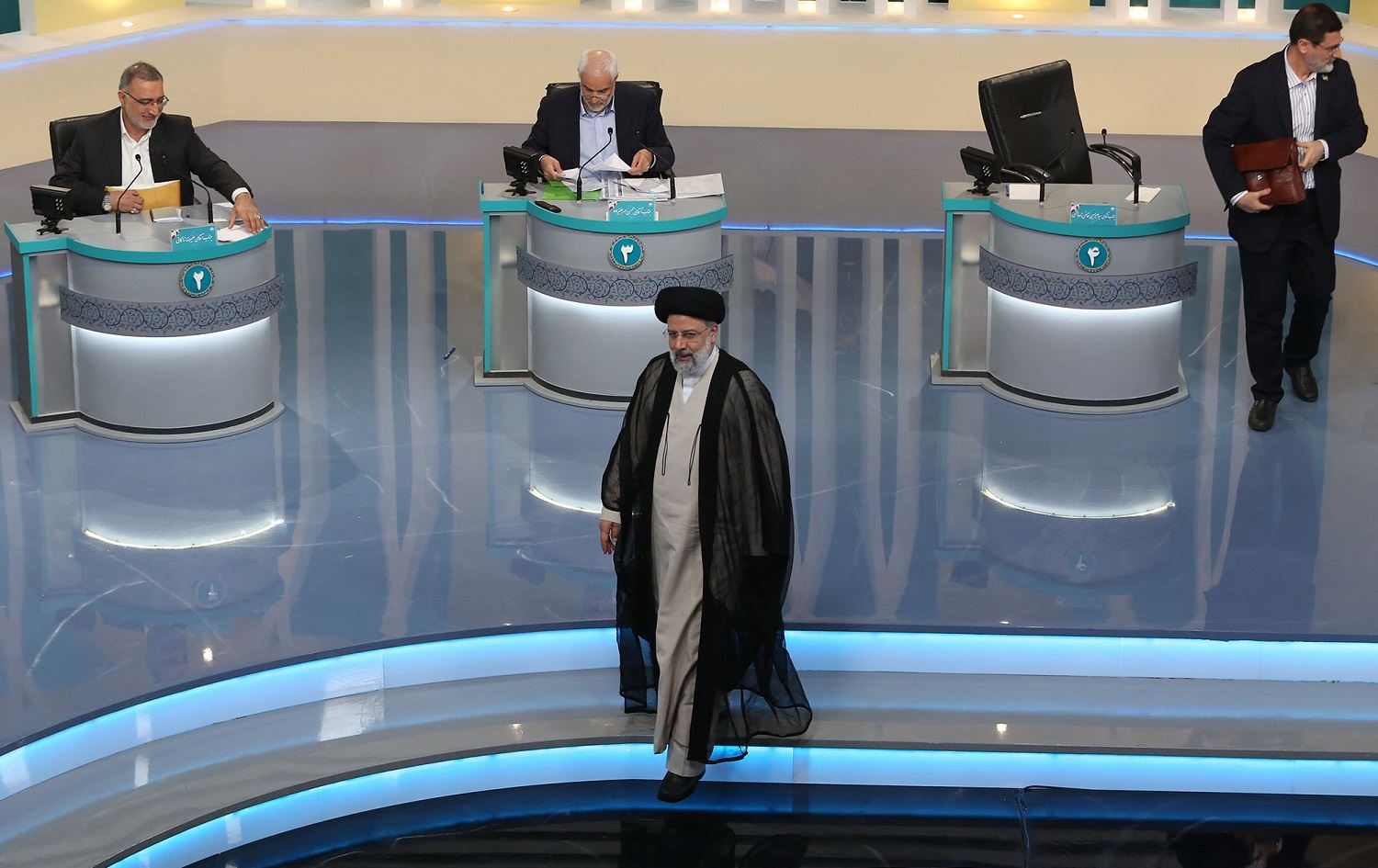 Iran's presidential candidates (top L to R) Alireza Zakani, Mohsen Mehralizadeh, Amirhossein Ghazizadeh-Hashemi, as Ebrahim Raisi steps down the stage during the second televised debate ahead of the June 18 election, at the Iran State television studio in Tehran on June 8, 2021. Photo: Iranian Young Journalist Club (YJC)/AFP