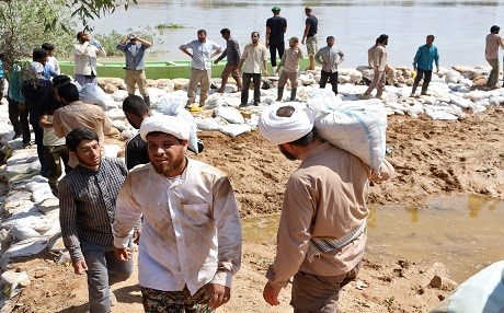 Hamidyeh residents fight against rising water after authorities ordered tens of thousands in the southwestern Iranian city to evacuate immediately as floodwaters entered the capital of oil-rich Khuzestan province, state television reported. Photo: AFP video