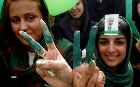Holding banners asking “Where is my vote?”, they waved green flags, Mousavi’s official campaign colour.