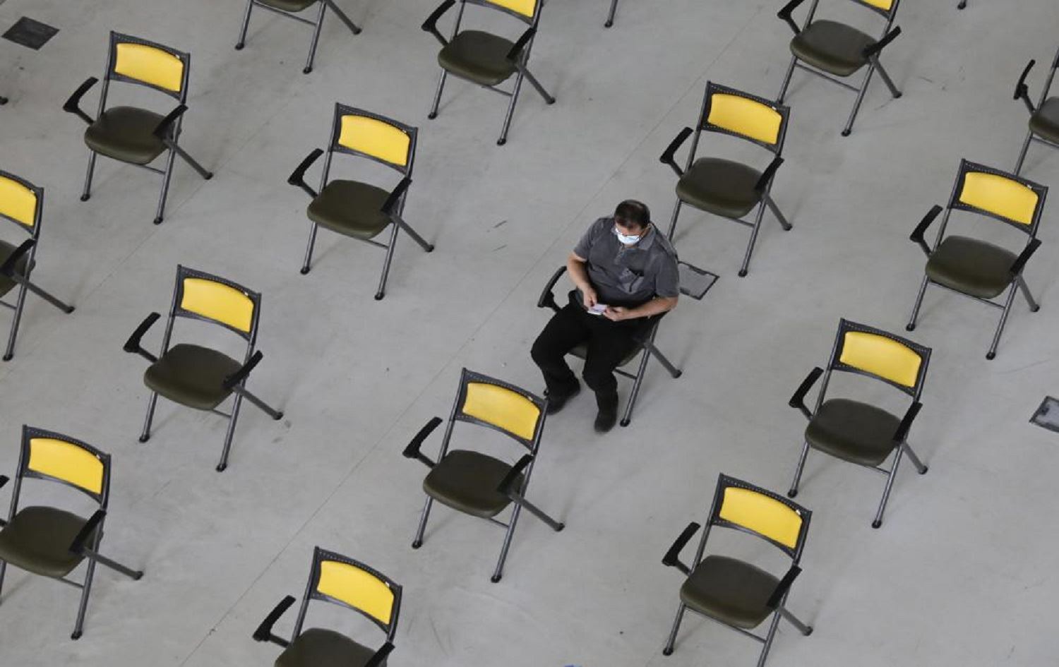 A man waits for his turn to receive the COVID-19 vaccine at a vaccination center in Iran Mall shopping center in Tehran, Iran on August 9, 2021. Photo: Vahid Salemi/AP