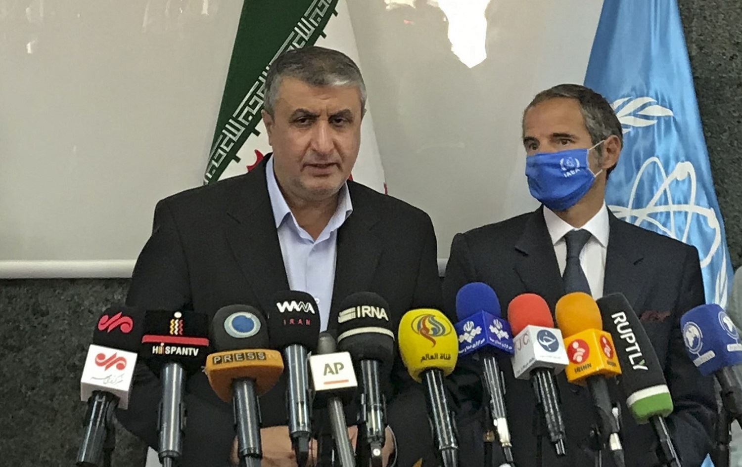 Head of the Atomic Energy Organization of Iran (AEOI) Mohammad Eslami speaks to the media next to Director General of the International Atomic Energy Agency (IAEA) Rafael Grossi following their meeting in Tehran on September 12, 2021. Photo: handout/AEOI/AFP