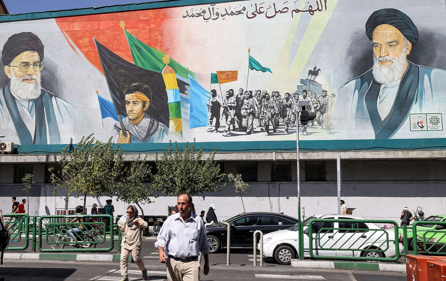 A mural depicting Ayatollah Ruhollah Khomeini (R), Iran's first supreme leader since the 1979 Islamic Revolution, and current Supreme Leader Ayatollah Ali Khamenei (L), is pictured as people cross Enghelab Square in central Tehran on September 10, 2023. Photo: Atta Kenare/AFP