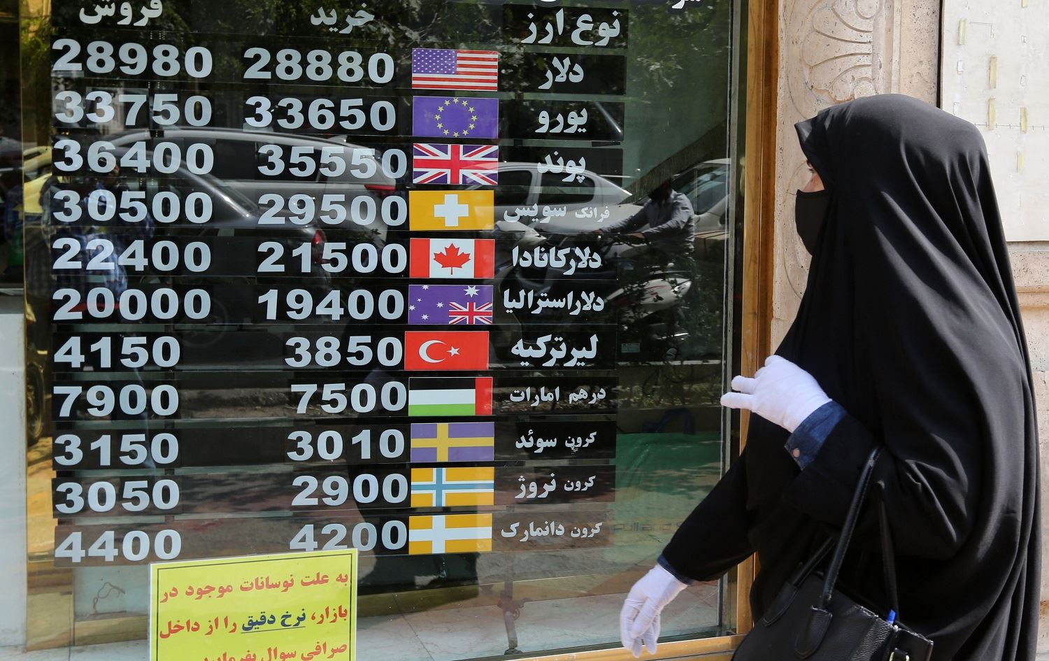 An Iranian woman checks a display board at a currency exchange shop as she walks by in the capital Tehran, on September 29, 2020. Photo: Atta Kenare / AFP