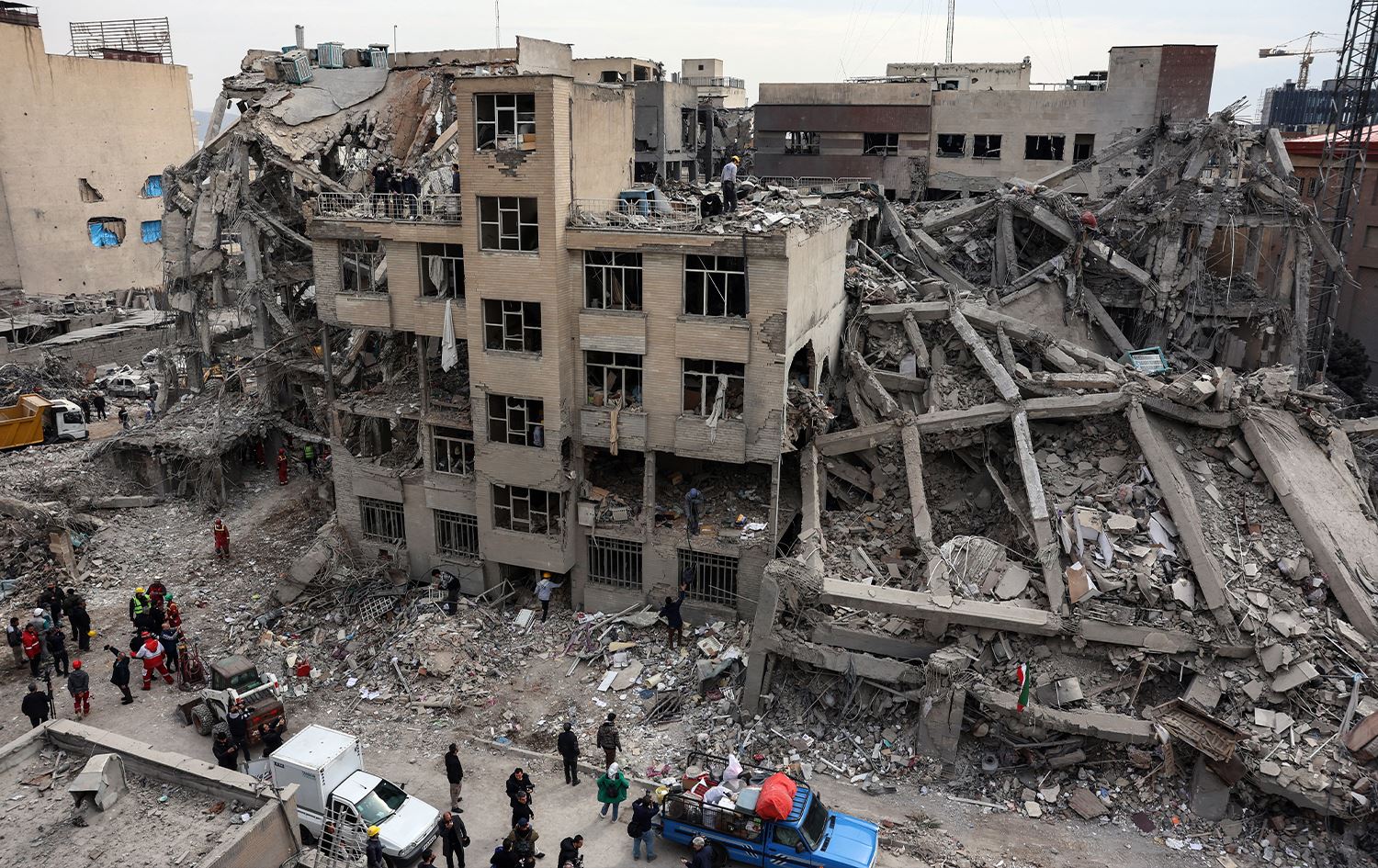 Rescue workers gather outside a damaged residential building as residents collect their belongings from the rubble in Tehran on March 12, 2026. Photo: AFP