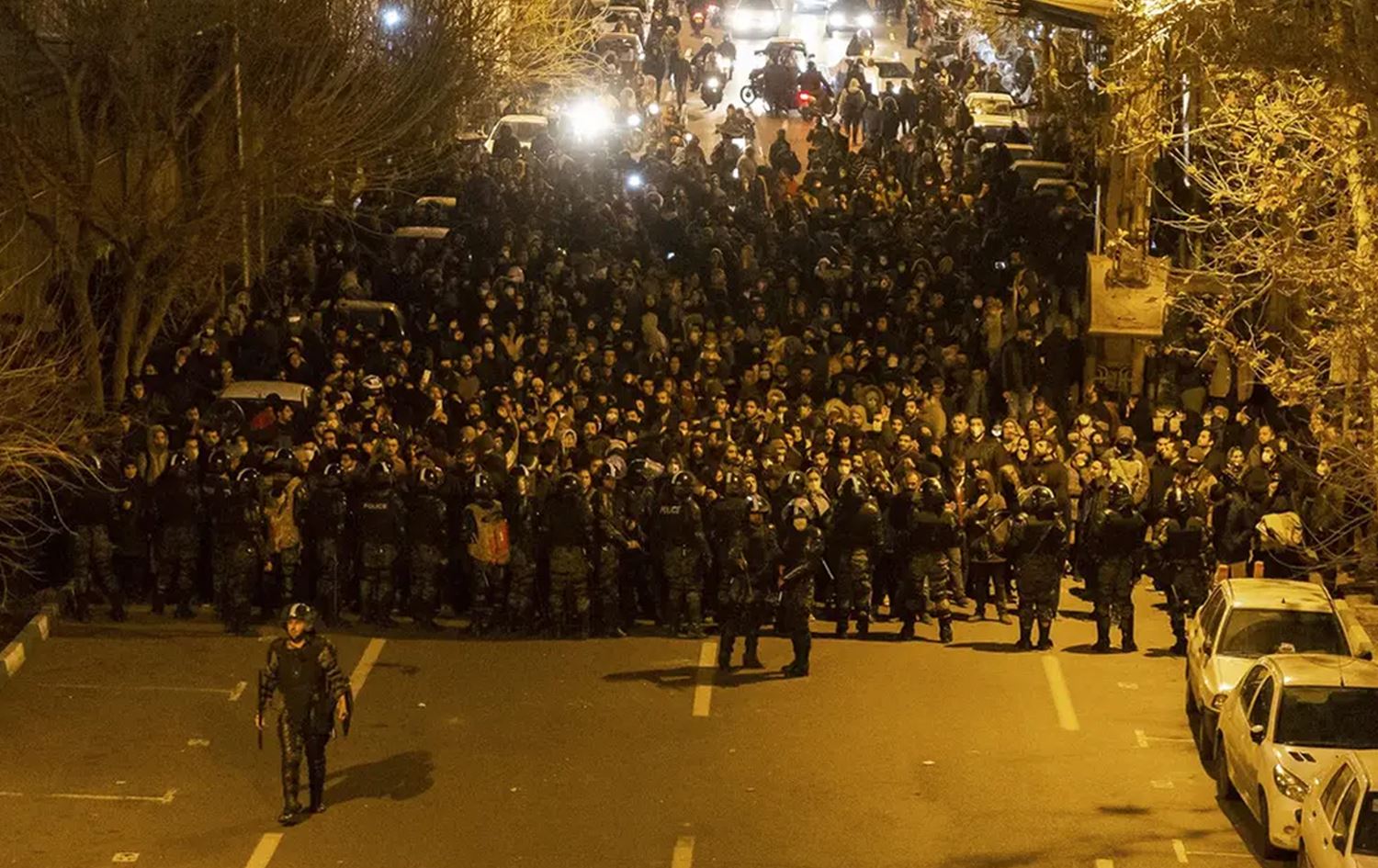 Iranian riot police stand guard as protesters gather in front of Tehran's Amir Kabir University in 2019. Photo: AFP