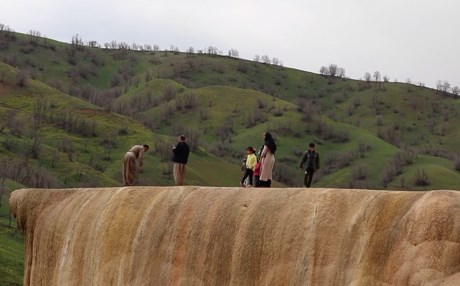 The spring's source is 12 kilometers away from Sardasht city. The mineral deposits give the mountain and rock a reddish-orange color.