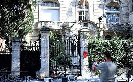 According to Fars News Agency, a group of around 15 Kurds affiliated with Komala, a Kurdish opposition party, arrived at the Iranian Embassy in Paris on Friday and proceeded to and smash its windows with stones, fire extinguishers, and computer parts and burn the Iranian flag. The activists did not breech the building itself.