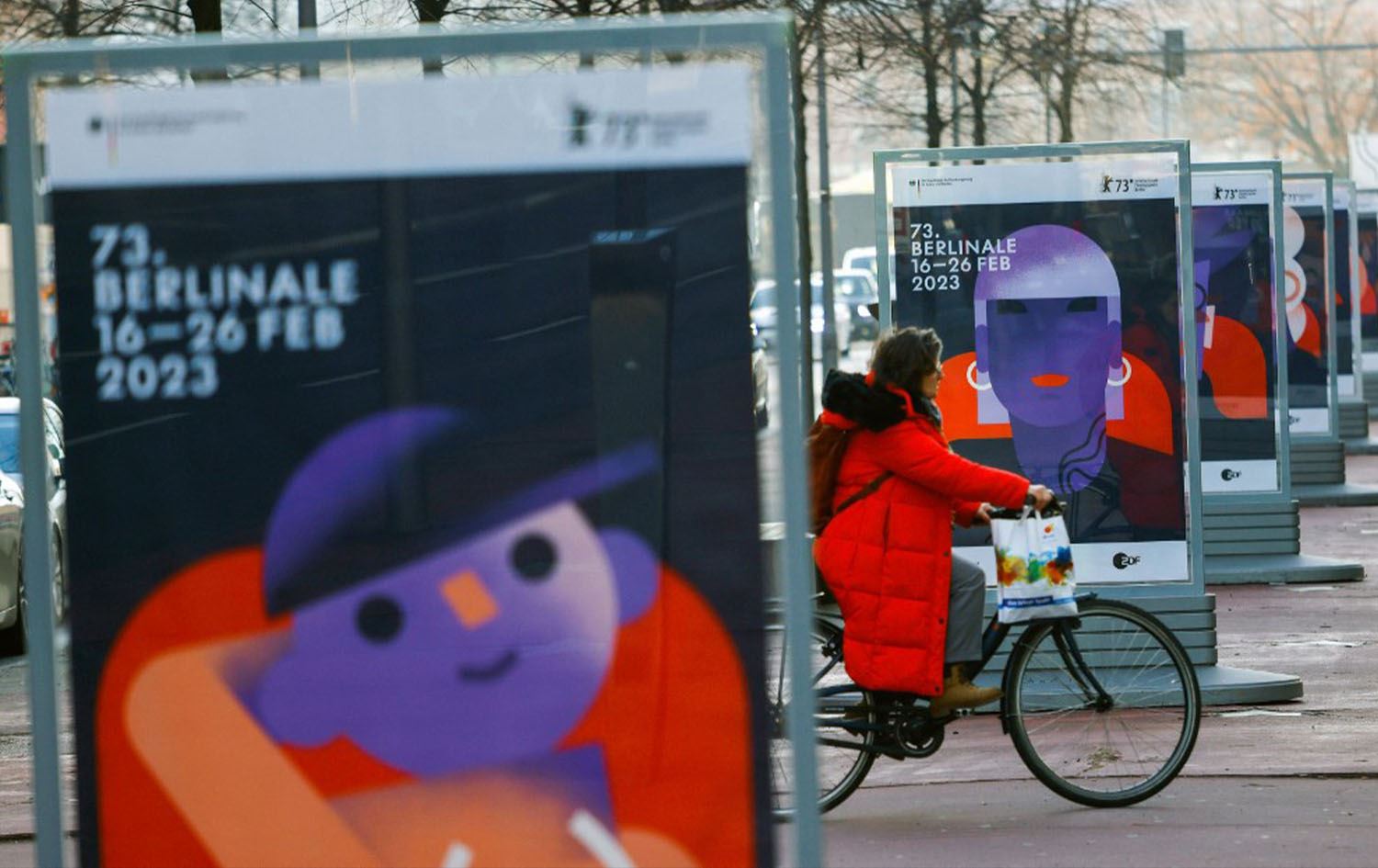 A woman cycles past a row of posters of the upcoming Berlinale 73rd International Film Festival in Berlin on February 15, 2023. Photo: David Gannon/AFP
