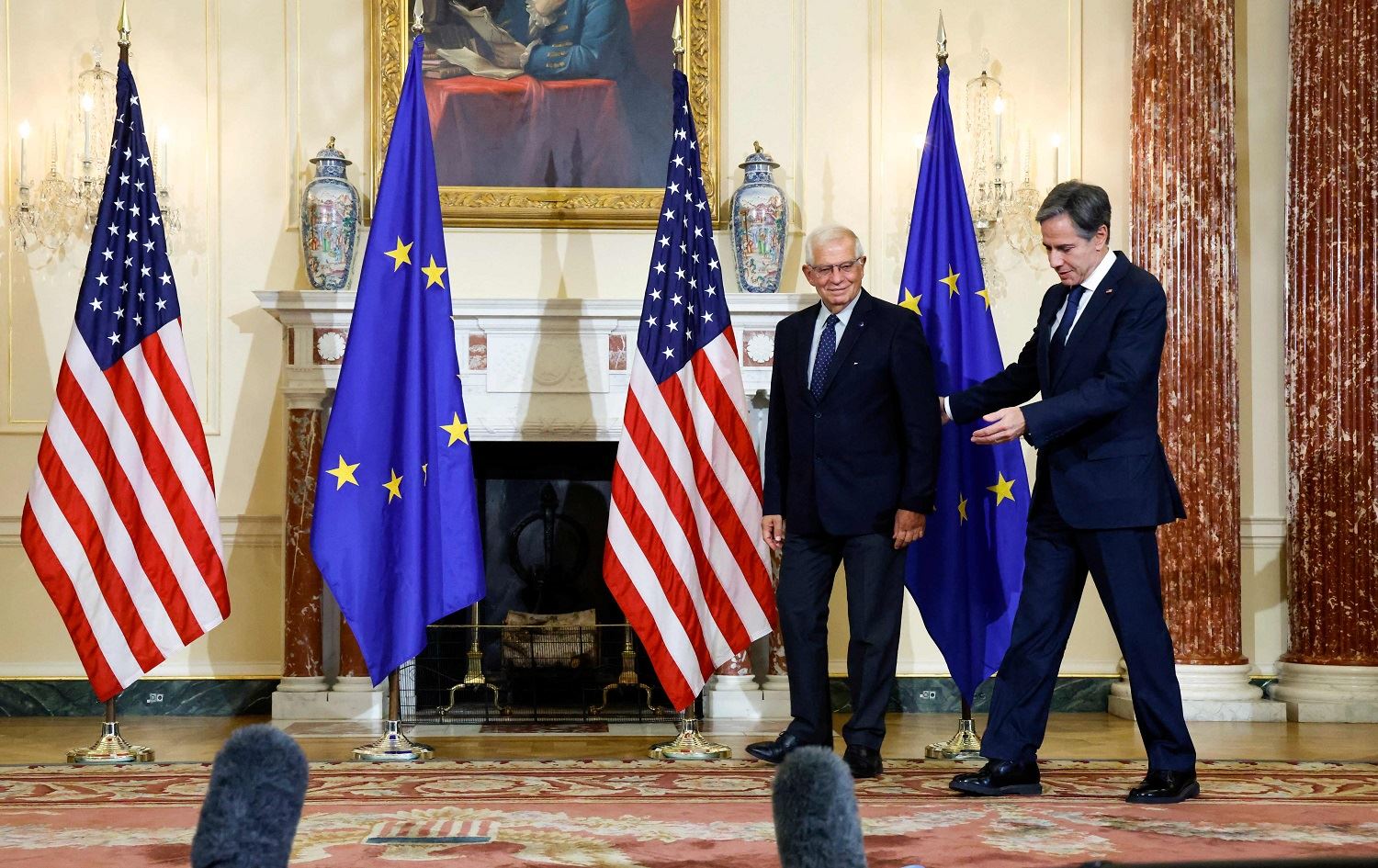 US Secretary of State Antony Blinken and EU High Representative for Foreign Affairs Josep Borrell arrive to speak to reporters before meeting in Washington on October 14, 2021. Photo: Jonathan Ernst/pool/AFP