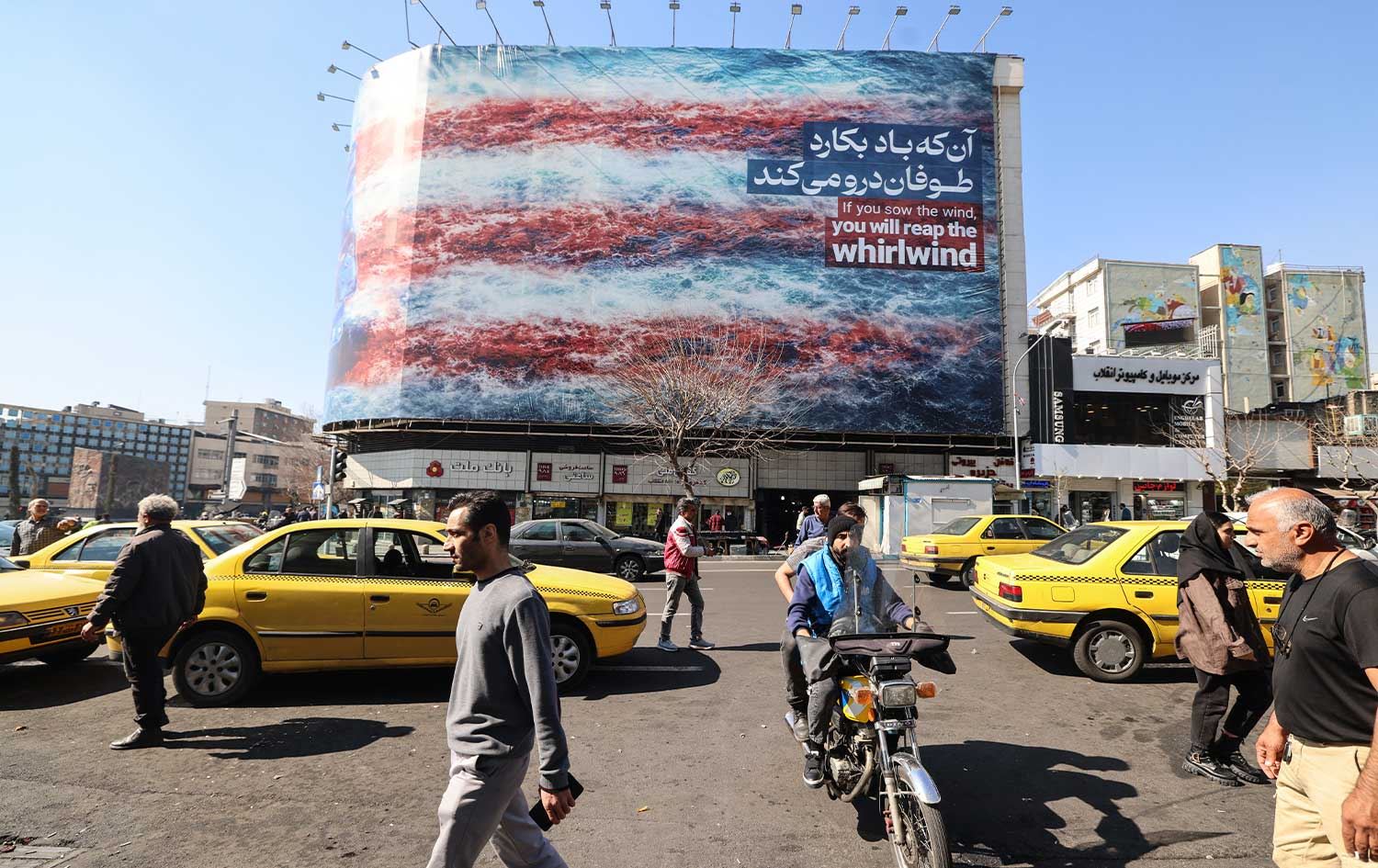 Iranians walk past an anti-US billboard installed on a building on Enqelab Square in Tehran on February 17, 2026. Photo: AFP