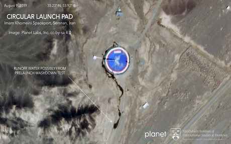 An August 9, 2019 satellite image from Planet Labs Inc., that has been annotated by experts at the James Martin Center for Nonproliferation Studies at Middlebury Institute of International Studies, shows activity at the Imam Khomeini Space Center in Iran's Semnan province. Photo: Planet Labs Inc, Middlebury Institute of International Studies via AP