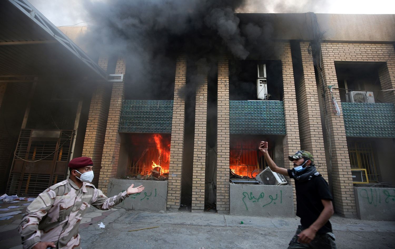A member of the Iraqi security forces intervenes as demonstrators burn down the KDP office in Baghdad on October 17, 2020. Photo: Ahmad al-Rubaye/AFP