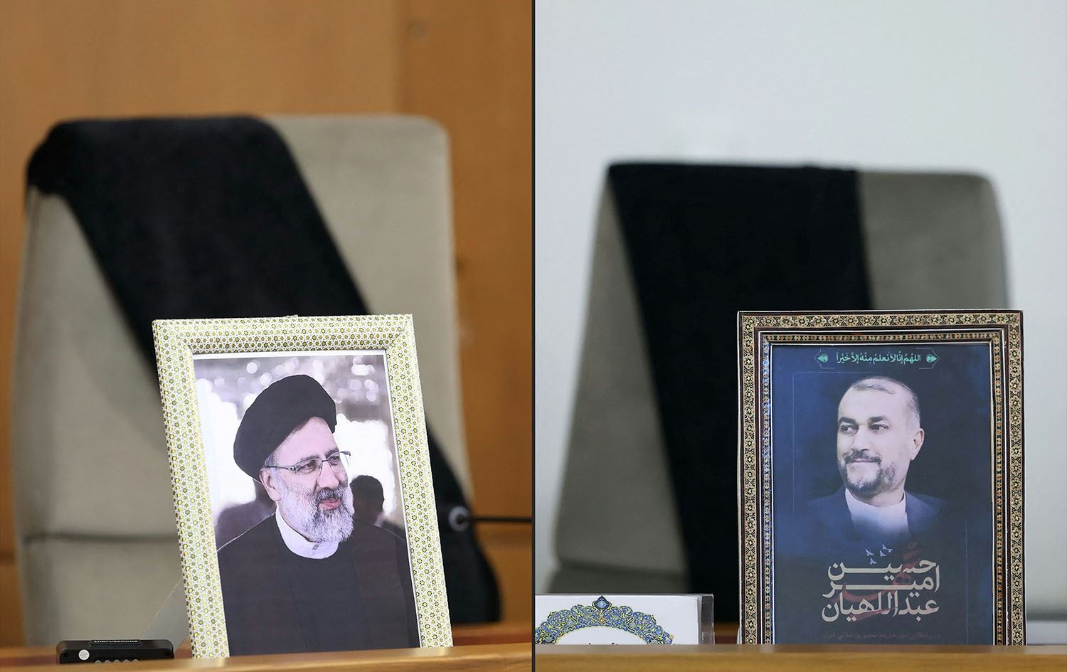 The empty seats of Iran's late president Ebrahim Raisi (L) and foreign minister Hossein Amir-Abdollahian during a cabinet meeting held on May 20, 2024. Photo: Iranian presidency / handout