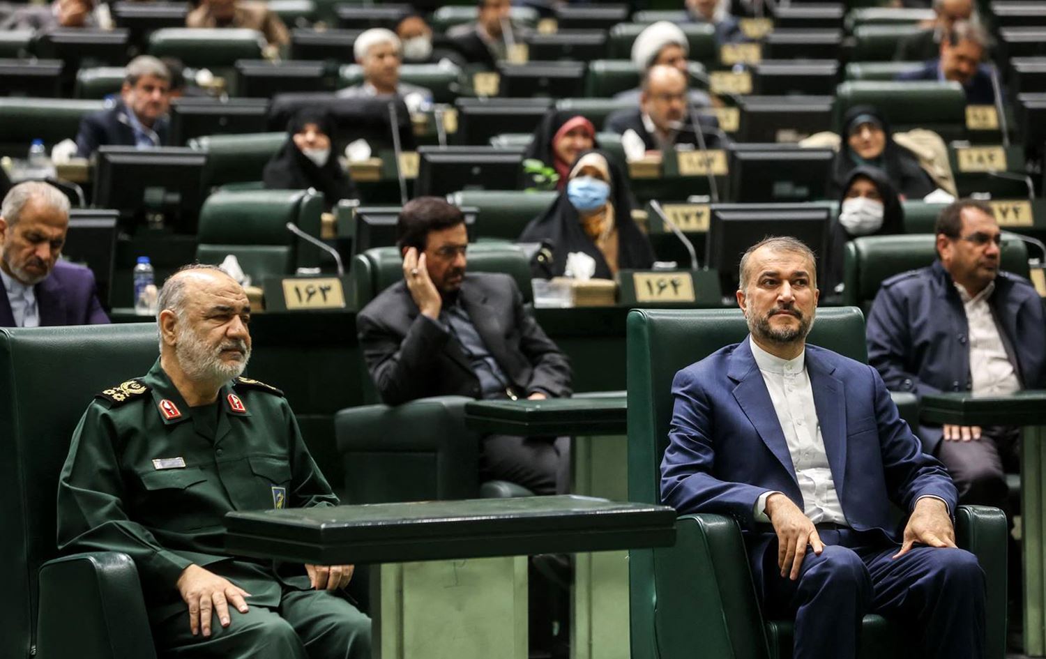 A handout picture provided by the Islamic Consultative Assembly News Agency (ICANA) on January 22, 2023, shows Islamic Revolutionary Guard Corps (IRGC) chief Hossein Salami (L) and Foreign Minister Hossein Amir-Abdollahian, attending a parliament meeting in the capital Tehran. Photo: ICANA/AFP
